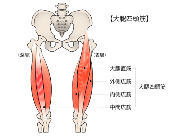 大腿四頭筋: 太ももの前面に位置し、膝を伸ばす役割を担います。ランニング中に足を前に出す際に重要です。